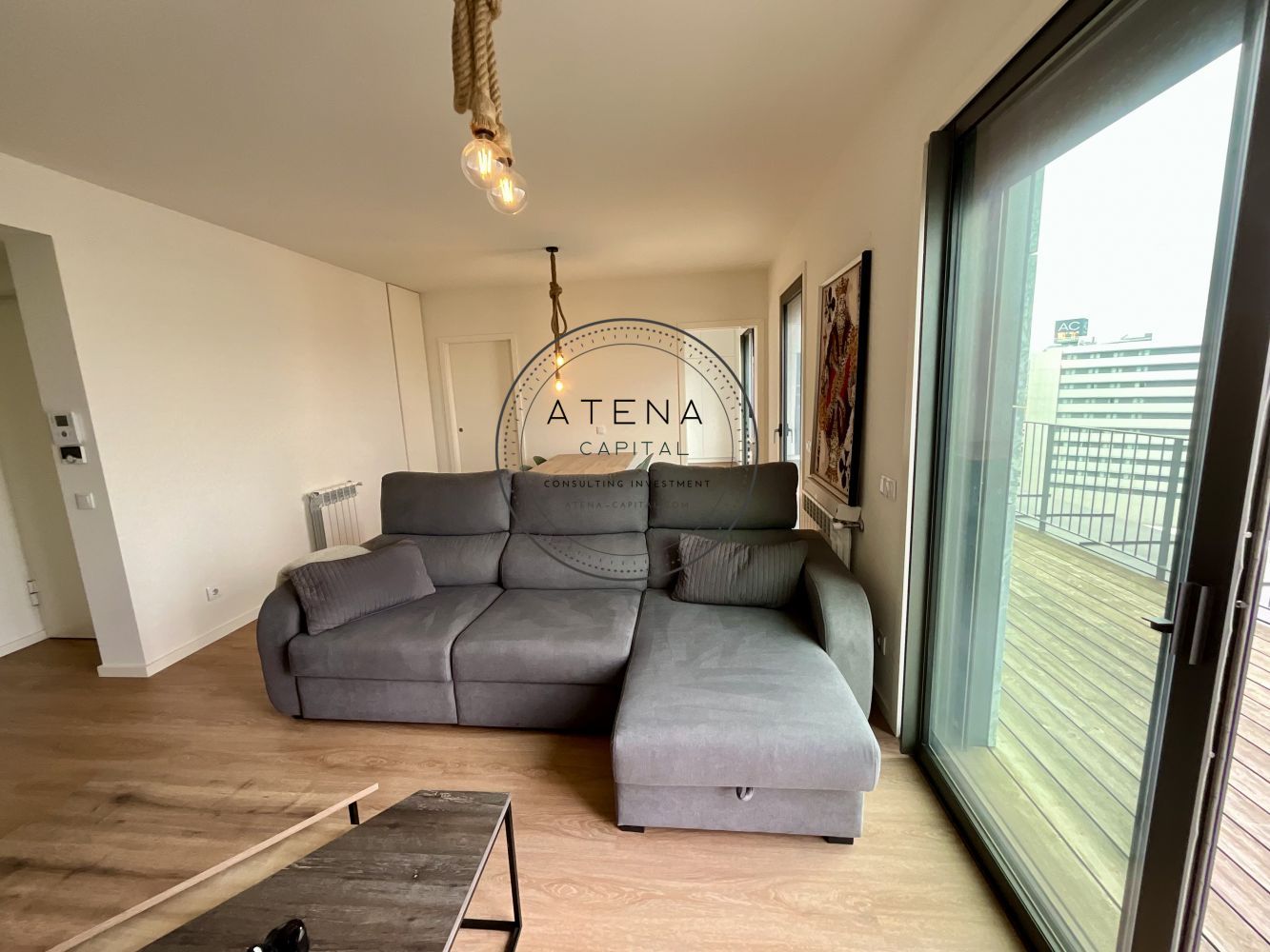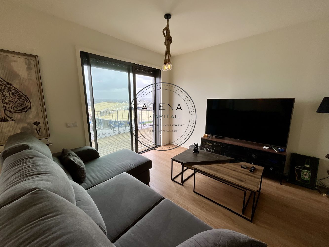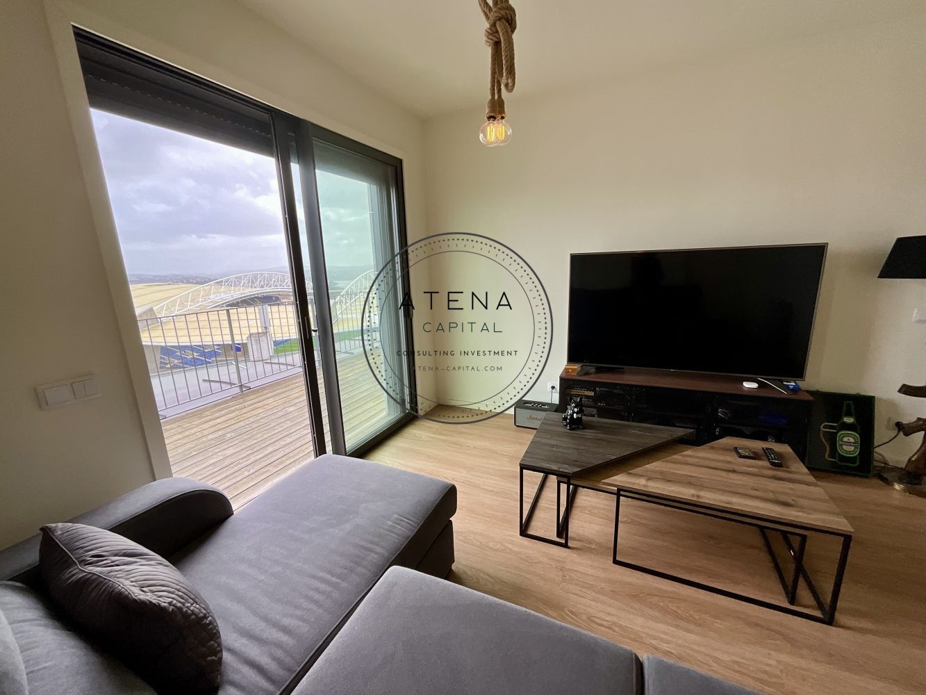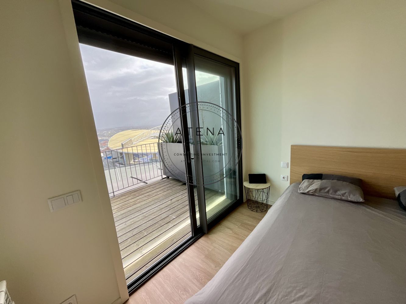 Apartamento T2 mobilado para arrendamento na Residência Antas Green, Porto. Apartamento situado no 7.º andar, com uma terraço excecional de 31 m², com vista desafogada para o rio e para o Estádio do Dragão (interior do estádio). Exposição solar Este. O imóvel tem 100 m² de área interior e é composto por sala ampla, cozinha totalmente equipada, dois quartos, sendo um quarto em suite e o segundo quarto com casa de banho completa mesmo em frente. Todas as divisões, sem exceção, têm acesso direto ao terraço como a sala, a cozinha e ambos os quartos. Pavimento em madeira em todo o apartamento. Quartos com roupeiros embutidos. Roupeiros adicionais na zona de entrada e áreas de circulação. Cozinha totalmente equipada com forno, placa, micro-ondas, frigorífico e restantes eletrodomésticos, conforme fotografias. Aquecimento central ao gás natural. Inclui 1 lugar de garagem e 1 arrecadação. Prédio com dois elevadores. A residência Antas Green é um condomínio moderno, com áreas comuns cuidadas, jardins e excelentes acessos. Localização extremamente central e prática, mesmo em frente ao Alameda Shopping e ao Continente, com metro à porta, várias linhas de autocarro, escolas, colégios, creches, serviços e comércio nas imediações. O apartamento é arrendado totalmente mobilado. A sala inclui mesa, cadeiras, móvel de televisão e sofá. Televisão não incluída. Os quartos incluem camas, colchões e mesas de cabeceira. Cozinha completamente equipada. Contrato de arrendamento com duração mínima de 1 ano. Arrendamento mobilado. Serão solicitados documentos comprovativos de rendimentos mensais. Caso os rendimentos apresentados não sejam suficientes, será exigido fiador, que deverá igualmente apresentar comprovativos de rendimentos. Condições de entrada: um mês de renda, um mês de caução e um mês correspondente ao último mês do contrato. Disponível para visitas mediante marcação e exclusivamente após reunião telefónica.