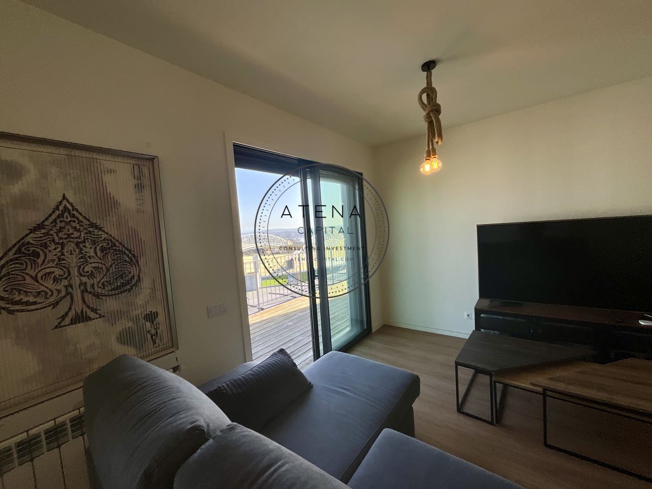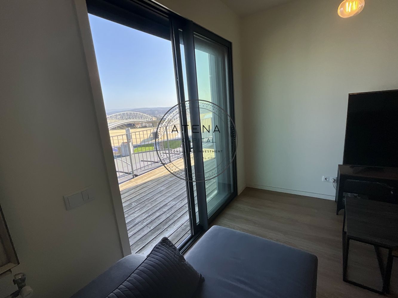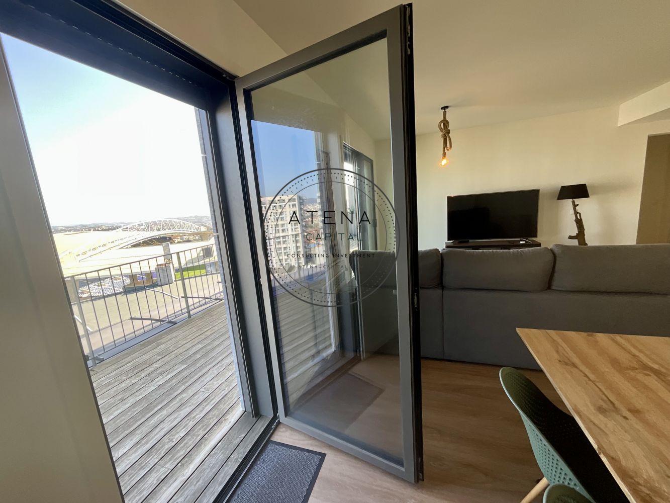Apartamento T2 mobilado para arrendamento na Residência Antas Green, Porto. Apartamento situado no 7.º andar, com uma terraço excecional de 31 m², com vista desafogada para o rio e para o Estádio do Dragão (interior do estádio). Exposição solar Este. O imóvel tem 100 m² de área interior e é composto por sala ampla, cozinha totalmente equipada, dois quartos, sendo um quarto em suite e o segundo quarto com casa de banho completa mesmo em frente. Todas as divisões, sem exceção, têm acesso direto ao terraço como a sala, a cozinha e ambos os quartos. Pavimento em madeira em todo o apartamento. Quartos com roupeiros embutidos. Roupeiros adicionais na zona de entrada e áreas de circulação. Cozinha totalmente equipada com forno, placa, micro-ondas, frigorífico e restantes eletrodomésticos, conforme fotografias. Aquecimento central ao gás natural. Inclui 1 lugar de garagem e 1 arrecadação. Prédio com dois elevadores. A residência Antas Green é um condomínio moderno, com áreas comuns cuidadas, jardins e excelentes acessos. Localização extremamente central e prática, mesmo em frente ao Alameda Shopping e ao Continente, com metro à porta, várias linhas de autocarro, escolas, colégios, creches, serviços e comércio nas imediações. O apartamento é arrendado totalmente mobilado. A sala inclui mesa, cadeiras, móvel de televisão e sofá. Televisão não incluída. Os quartos incluem camas, colchões e mesas de cabeceira. Cozinha completamente equipada. Contrato de arrendamento com duração mínima de 1 ano. Arrendamento mobilado. Serão solicitados documentos comprovativos de rendimentos mensais. Caso os rendimentos apresentados não sejam suficientes, será exigido fiador, que deverá igualmente apresentar comprovativos de rendimentos. Condições de entrada: um mês de renda, um mês de caução e um mês correspondente ao último mês do contrato. Disponível para visitas mediante marcação e exclusivamente após reunião telefónica.